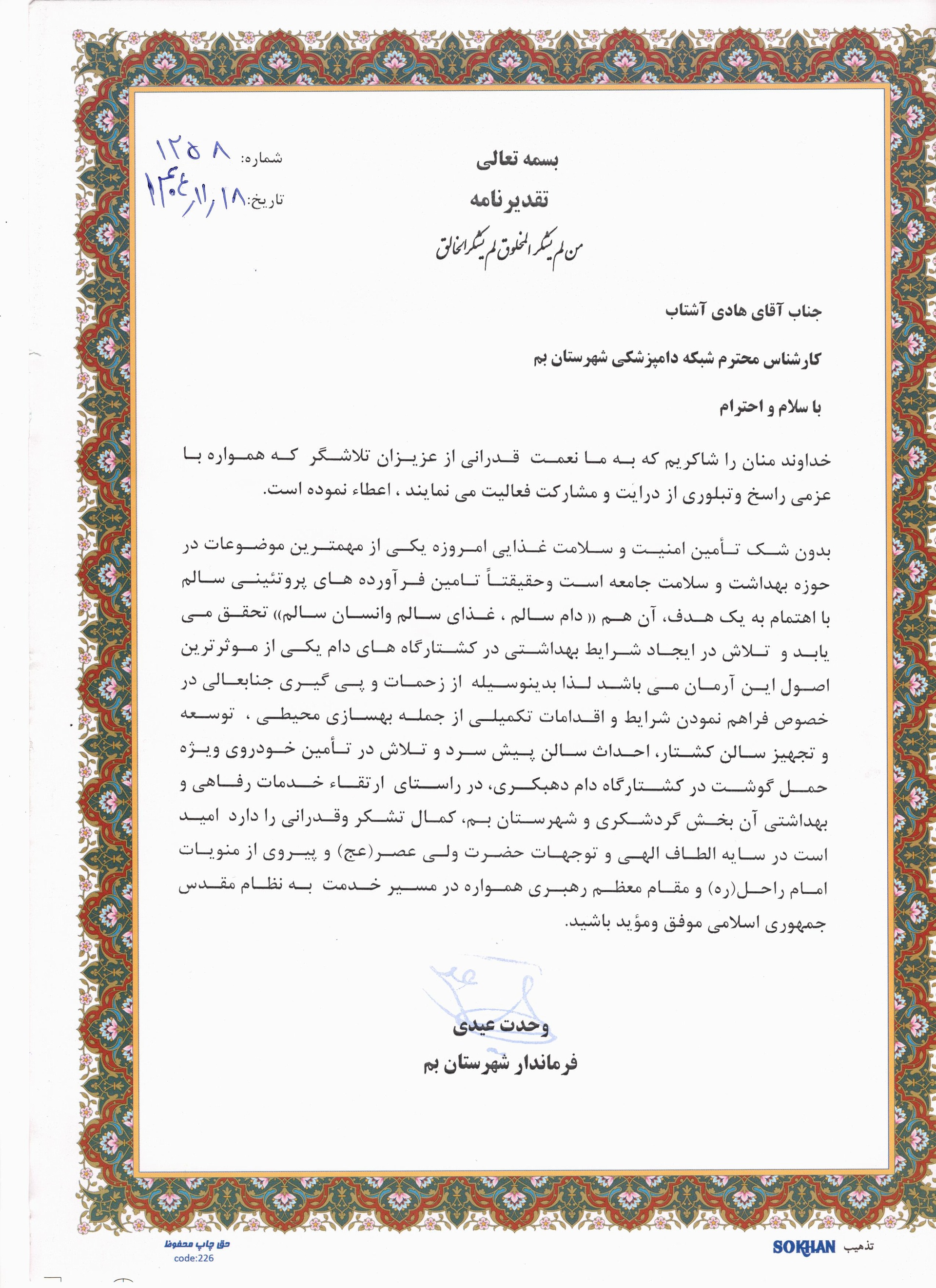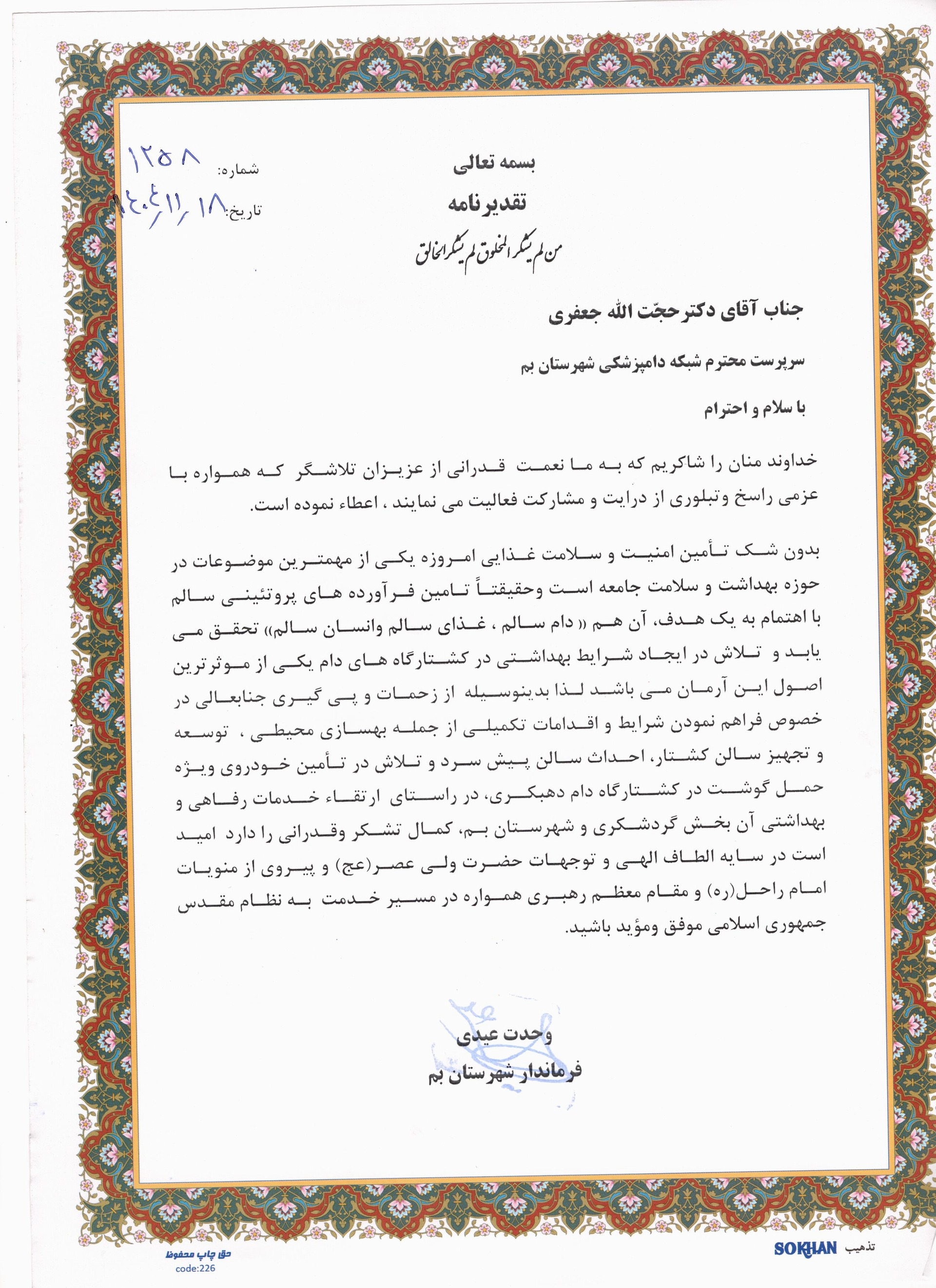 بدون شک تامین امنیت و سلامت غذایی امروزه یکی از مهم ترین موضوعات در حوزه بهداشت و سلامت جامعه است و حقیقتا تامین فرآورده های پروتئینی سالم با اهتمام به یک هدف آن هم ( دام سالم، غذای سالم و انسان سالم ) تحقق می یابد و تلاش در ایجاد شرایط بهداشتی در کشتارگاه های دام یکی از موثرترین اصول این آرمان می باشد. لذا بدینوسیله از زحمات و پیگیری جنابعالی در خصوص فراهم نمودن شرایط و اقدامات تکمیلی از جمله بهسازی محیطی، توسعه و تجهیز سالن کشتارگاه، احداث سالن پیش سرد و تلاش در تامین خودروی ویژه حمل گوشت در کشتارگاه دام دهبکری، در راستای ارتقا خدمات رفاهی و بهداشتی آن بخش گردشگری و شهرستان بم، کمال تشکر و قدردانی را دارد. امید است در سایه الطاف الهی و توجهات حضرت ولی عصر (عج) وپیروی از منویات امام راحل (ره) و مقام معظم رهبری همواره در مسیر خدمت به نظام مقدس جمهوری اسالامی موفق و موید باشید.