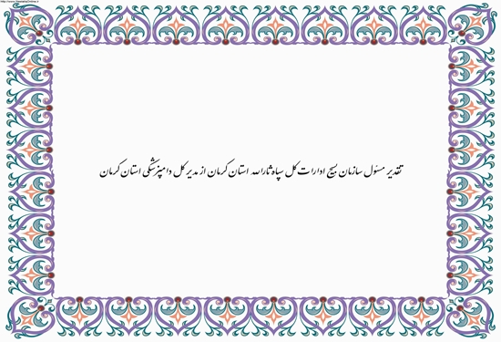 تلاش های خالصانه و صادقانه شما آینه وظیفه شناسی و پژواک دانایی و تعهد است. بدینوسیله از زحمات و تلاش های بی دریغ شما در خدمت رسانی به مردم شریف کشور جمهوری اسلامی ایران صمیمانه تقدیر و تشکر به عمل می آید. نتیجه بذر تلاش و کوشش شما درخت امیدی است که به بار می نشیند و نوید بخش آینده ای پر نشاط و زیباست. درود بر همت بلندتان. توفیق و سلامتی شما را از درگاه ایزد منان مسئلت داریم.