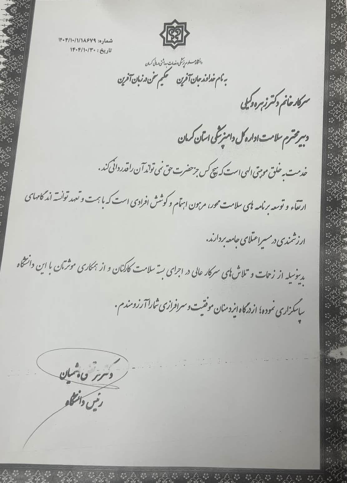 خدمت به خلق محبتیست که هیچکس جز حضرت حق نمیتواند آن را قدردانی کند، ارتقا توسعه برنامههای سلامت محور مرهون اهتمام و کوشش افرادی است که با همت و تعهد توانستند گامهای ارزشمندی در مسیر اعتلای جامع بردارند، بدین وسیله از زحمات و تلاشهای سرکار عالی در اجرای بسته سلامت کارکنان و از همکاری موثرتان با این دانشگاه سپاسگزاری نموده از درگاه ایزد منان موفقیت و سرافرازی شما را آرزومندم.