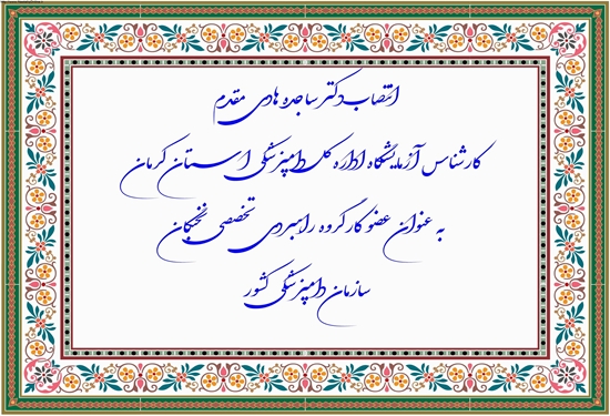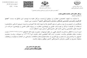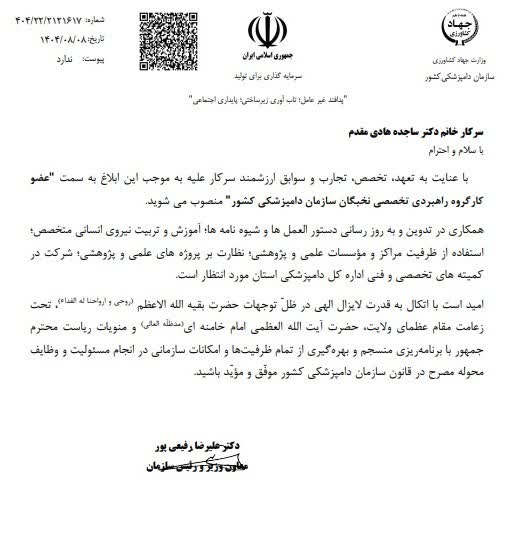 با عنایت به تعهد، تخصص، تجارب و سوابق ارزشمند سرکار علیه به موجب این ابلاغ به سمت "عضو کارگروه راهبردی تخصصی نخبگان سازمان دامپزشکی کشور" منصوب می شوید. همکاری در تدوین و به روز رسانی دستور العمل ها و شیوه نامه ها؛ آموزش و تربیت نیروی انسانی متخصص؛ استفاده از ظرفیت مراکز و مؤسسات علمی و پژوهشی؛ نظارت بر پروژه های علمی و پژوهشی؛ شرکت در کمیته های تخصصی و فنی اداره کل دامپزشکی استان مورد انتظار است. ، تحت امید است با اتکال به قدرت لایزال الهی در ظلّ توجهات حضرت بقیه الله الاعظم (روحی و ارواحنا له الفداء) و منویات ریاست محترم زعامت مقام عظمای ولایت، حضرت آیت الله العظمی امام خامنه ای(مدظلّه العالی) جمهور با برنامهریزی منسجم و بهرهگیری از تمام ظرفیتها و امکانات سازمانی در انجام مسئولیت و وظایف محوله مصرح در قانون سازمان دامپزشکی کشور موفّق و مؤیّد باشید.