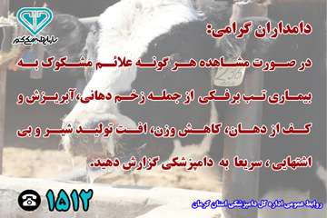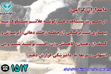 توصیه های بهداشتی روابط عمومی اداره کل دامپزشکی استان کرمان در خصوص بیماری تب برفکی (6) 1404/08/27 - 10:07 - تعداد بازدید: 17 - کد خبر : 348359 - گروه خبری : عکس - تعداد نظرات : 0