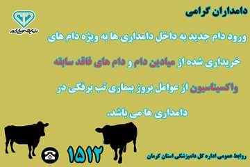 توصیه های بهداشتی روابط عمومی اداره کل دامپزشکی استان کرمان در خصوص بیماری تب برفکی (7) 1404/09/08 - 11:13 - تعداد بازدید: 7 - کد خبر : 348738 - گروه خبری : عکس - تعداد نظرات : 0