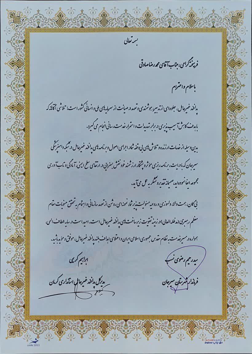 این تجلیل به پاس اجرای موفقیتآمیز اصول و برنامههای پدافند غیرعامل در شبکه دامپزشکی صورت گرفت.