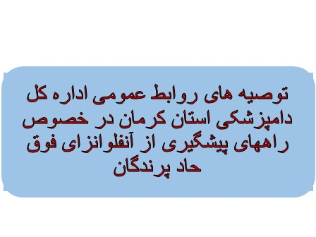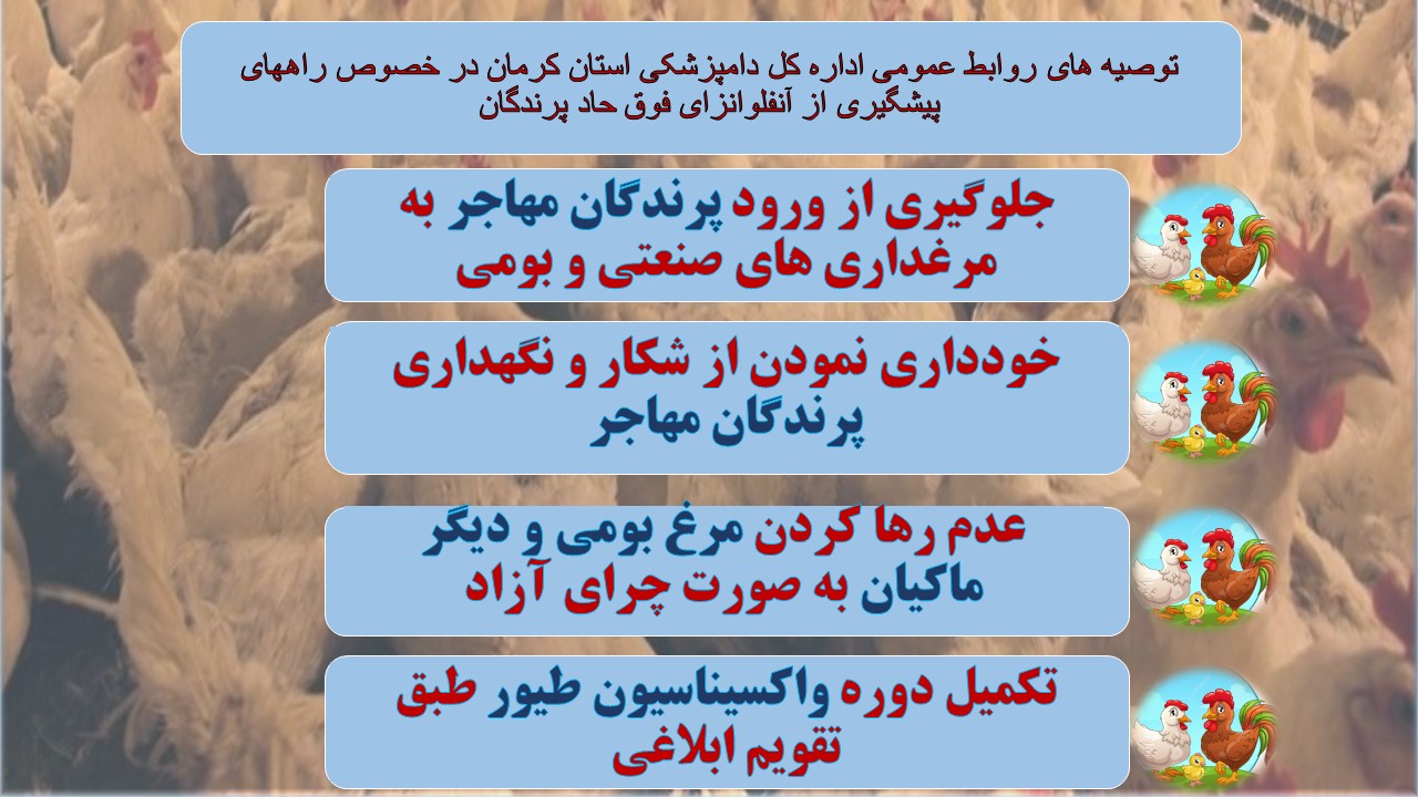 توصیه های روابط عمومی اداره کل دامپزشکی استان کرمان در خصوص راههای پیشگیری از آنفلوانزای فوق حاد پرندگان 1404/10/03 - 09:12 - تعداد بازدید: 28 - کد خبر : 349740 - گروه خبری : اطلاعیه ها / اردوهای جهادی - تعداد نظرات : 0